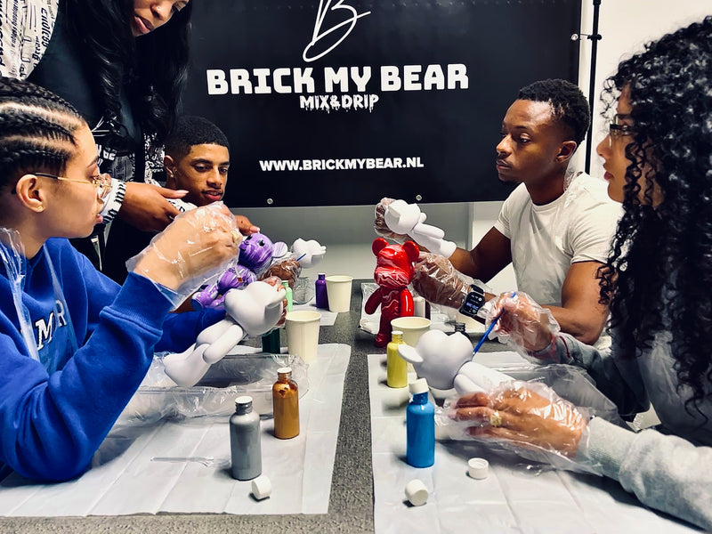 MIX de verf in de meegeleverde beker. DRIP deze over je BEARBRICK. Om een marmer-effect te creëren is het belangrijk om de verf niet te roeren.